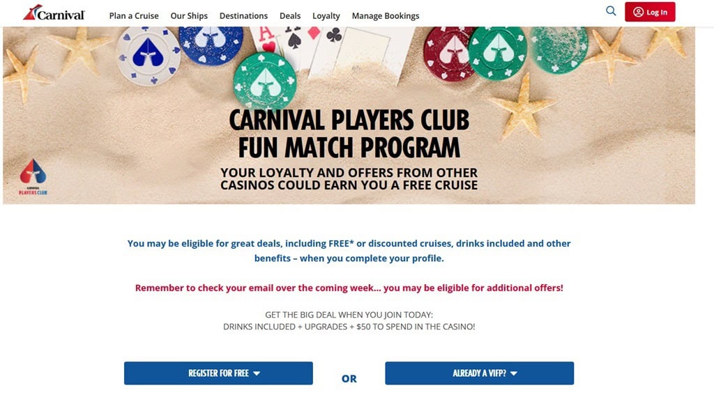 Shortly after completing the form, you’ll start receiving marketing emails from the Carnival Players Club. If the initial offers don’t seem that exciting, like a discount instead of a free room, don’t panic. Carnival frequently changes and updates the offers, typically on a monthly basis, in order to fill up cruises that might not be selling.